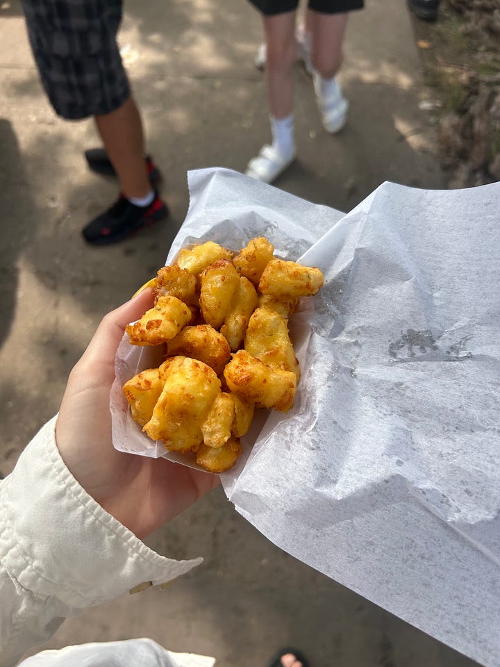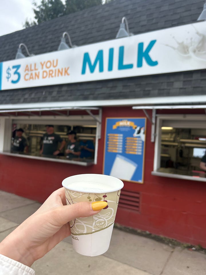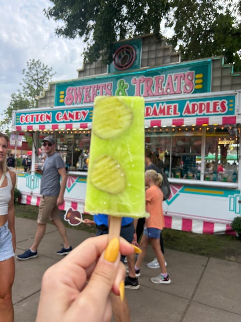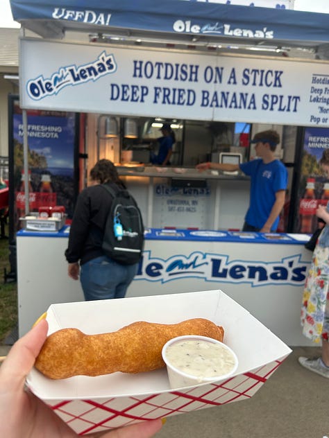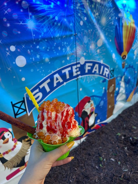 I thought maybe the politics of it all would interest me but what I was really curious about was the food. At the fair I ate, in order: a pickle on a stick; cheese curds; hotdish on a stick1; a cup of milk from the all-you-can-drink milk vendor; a cup of chocolate milk from the all-you-can-drink milk vendor; cheese curds (ranch flavored); chocolate chip cookies from Martha’s Cookies; a lemon-pickle popsicle from the Lutheran cafeteria; a sour beer from a local microbrewery; walleye cakes and some kind of dumpling situation, before a lumberjack show; a virgin Bloody Mary, which kind of changed my life because I always want a Bloody Mary but don’t always want alcohol; a sip of lemonade; and finally, a shave ice concoction with tajin and condensed milk and popping boba that, despite my best efforts, I was unable to finish.